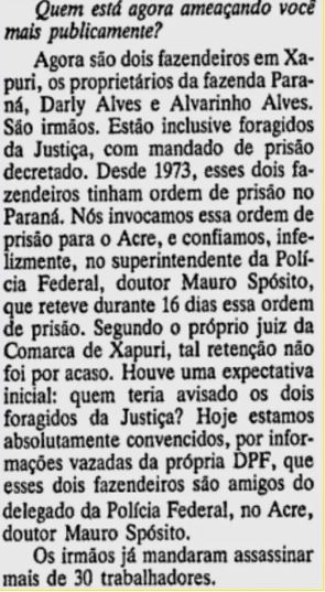 Dado todo este historial, y las causas que se han levantado sin prosperar contra Darly y Darcy (como el asesinato de dos ciudadanos bolivianos en la zona), se hace bastante extraño que a los 6 años del asesinato de Chico Mendes ambos estén libres. A menos que se entienda que las estructuras de poder no son solo siglas de partidos, sino relaciones, que permiten capacidad de maniobra entre instituciones para los más poderosos.